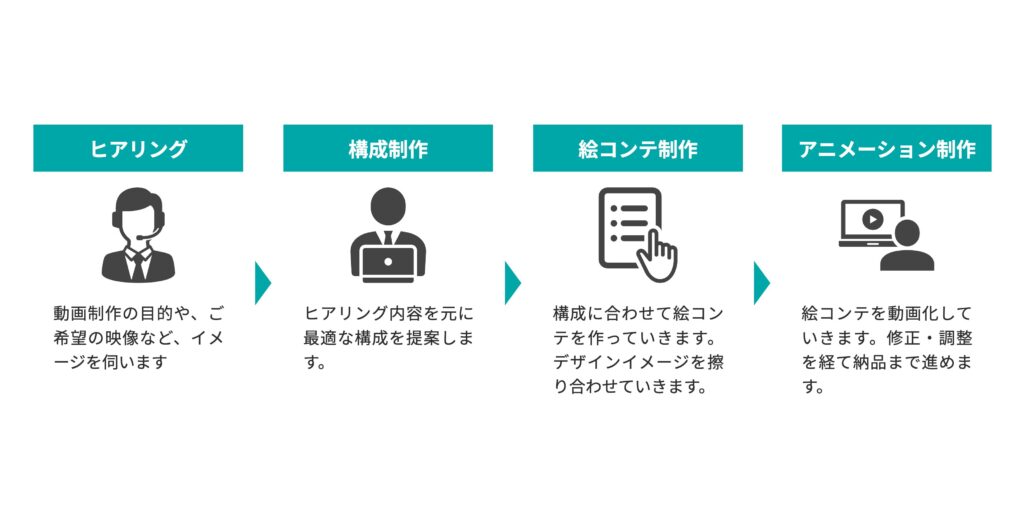 A. はい、全く問題ありません。「商品・サービスの魅力をどう伝えればいいか分からない」という段階から丁寧にヒアリングを行い、ターゲットに響く最適な構成・シナリオをご提案いたします。企画から納品までワンストップでお任せください。
