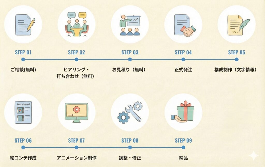 A. はい、全く問題ありません。「商品・サービスの魅力をどう伝えればいいか分からない」という段階から丁寧にヒアリングを行い、ターゲットに響く最適な構成・シナリオをご提案いたします。企画から納品までワンストップでお任せください。
